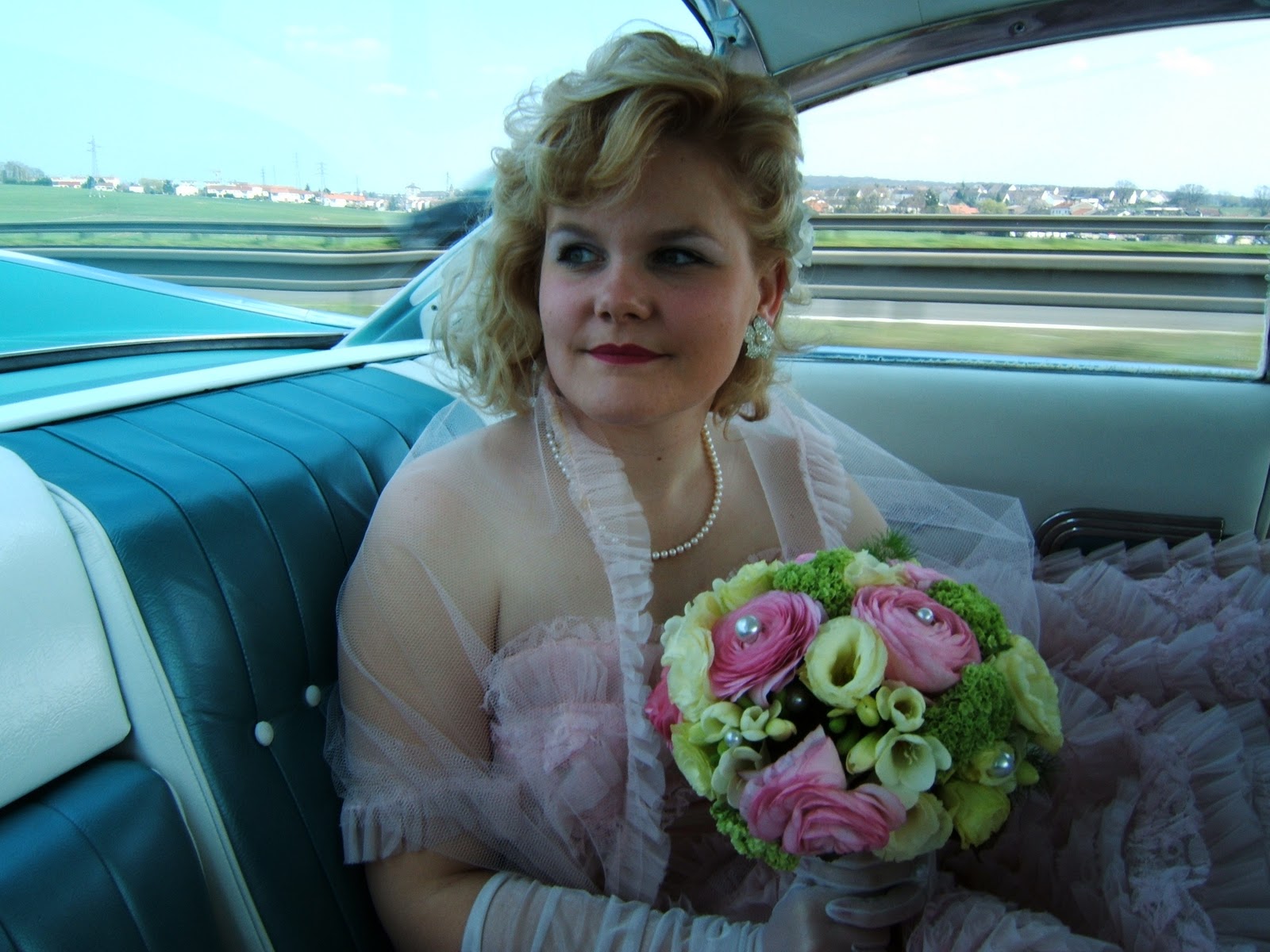 So let's speak about the most important thing for a girl: her wedding dress!!! Mine was not a real wedding dress, but a light pink vintage prom dress from the 50's with a matching stole. My shoes were 50's lucite and gold leather high heels, I realize that I have no pictures of them from this day... I was wearing silk white flowers on my hairs, white gloves and pearl jewels. I also had a white rabbit fur stole for the evening, also from the 50's.